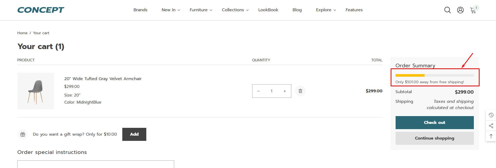 Free shipping notification shows a progressive bar with a message when customers put more items in their shopping carts.